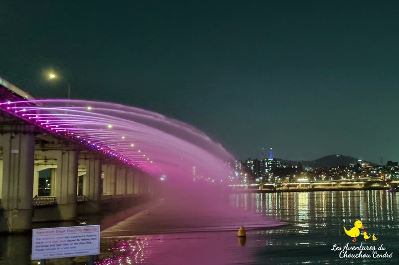 Fontaine le long d’un pont, avec des spectacles de lumières réguliers certains mois.