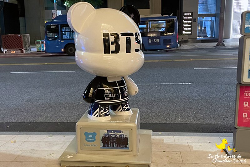 Avenue commerçante (boutiques de luxe) animée en hommage aux stars de la pop coréenne dont les noms sont peints sur des poupées en forme d’ours.