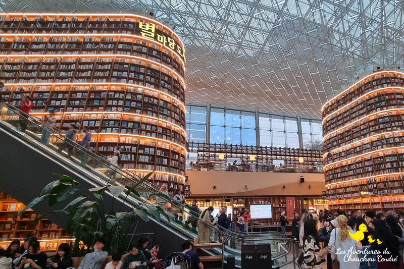 Bibliothèque géante lumineuse, située dans un centre commercial.