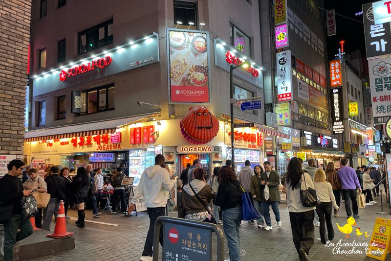 Quartier animé avec street food (brochettes, tteokbokki, poulet frit…) et magasins colorés (cosmétiques, K-pop).