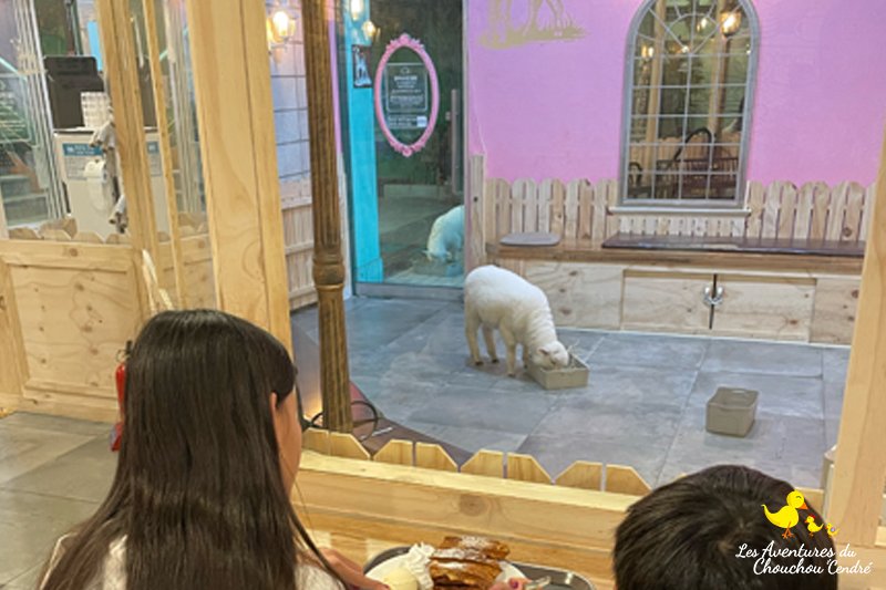 Un beau café où résident 2 petits moutons très doux. Un seul acceptait de se faire caresser !
